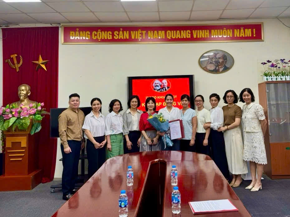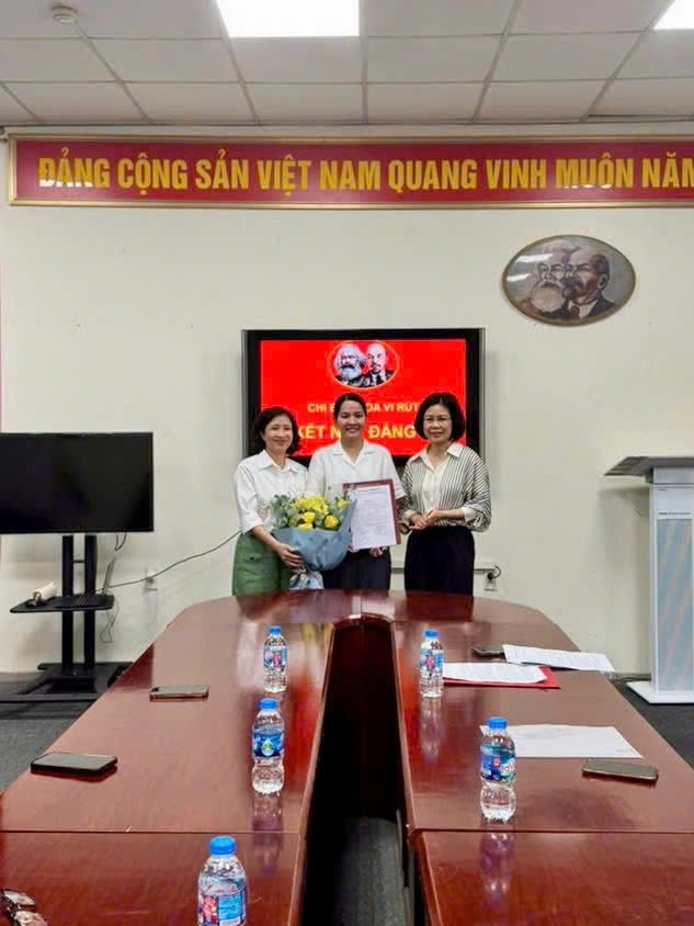 Đồng chí Nguyễn Thị Thu Hà (Thường vụ Đảng ủy Viện) trao Quyết định; đồng chí Hoàng Vũ Mai Phương (Bí thư Chi bộ) tặng hoa cho đảng viên mới Đào Thị Hải Anh.
